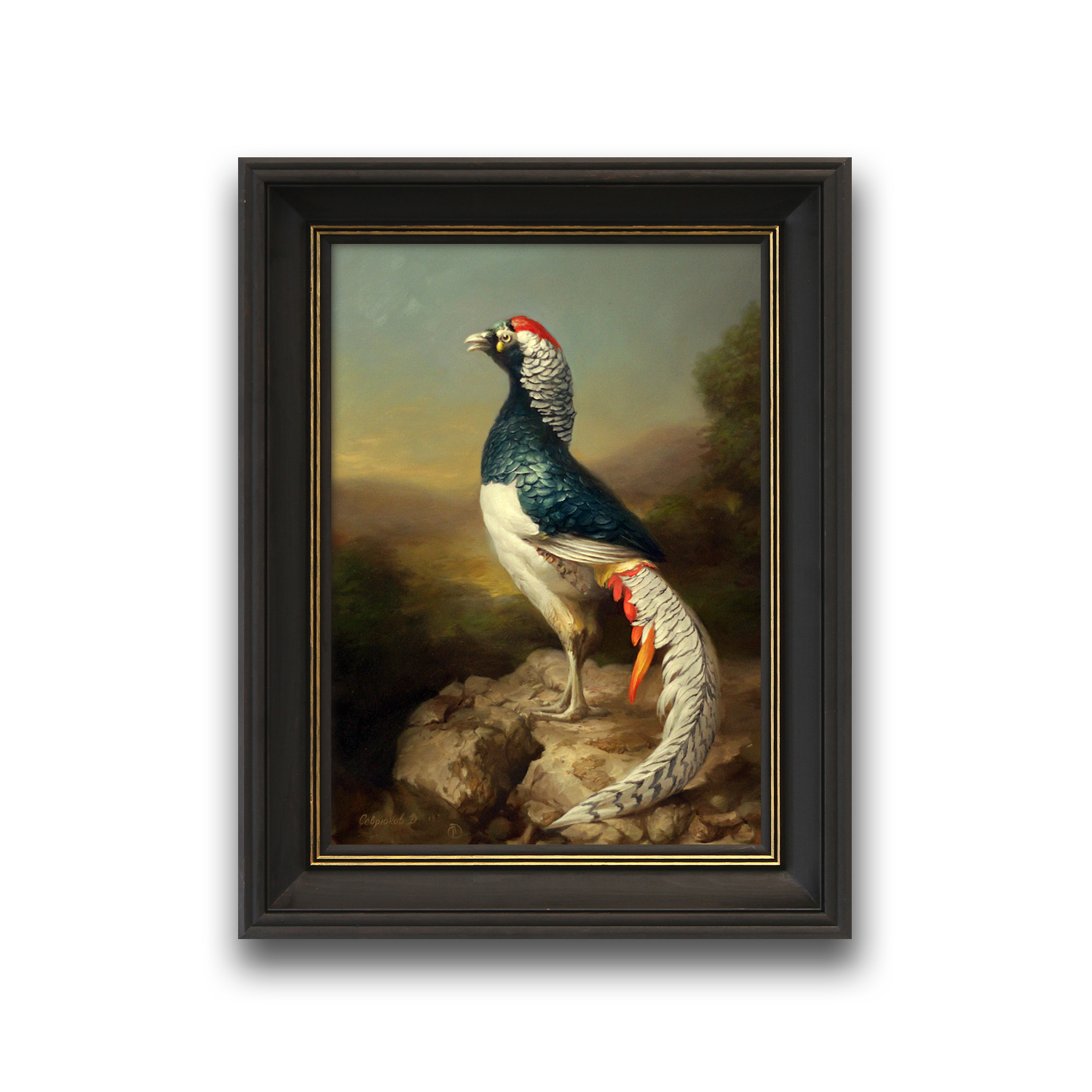 На картине изображён фазан, стоящий на скалистой поверхности. Птица представлена в профиль, с гордой осанкой. Оперение фазана яркое и детализированное: спина и крылья окрашены в насыщенный тёмно-зелёный цвет, грудь и живот — белые, а на голове выделяется ярко-красный гребень. Хвост длинный, с изящным узором из белых и чёрных полос, с вкраплениями оранжевых деталей.