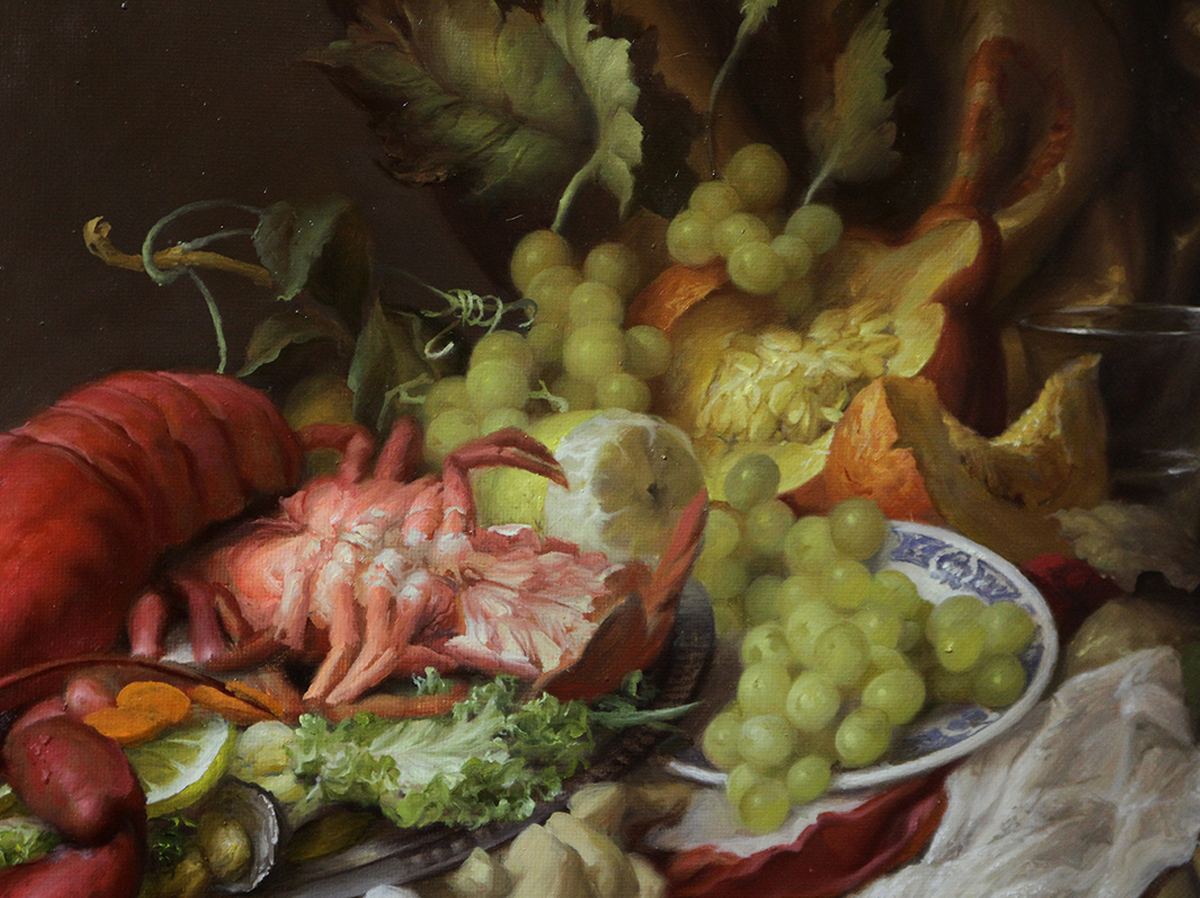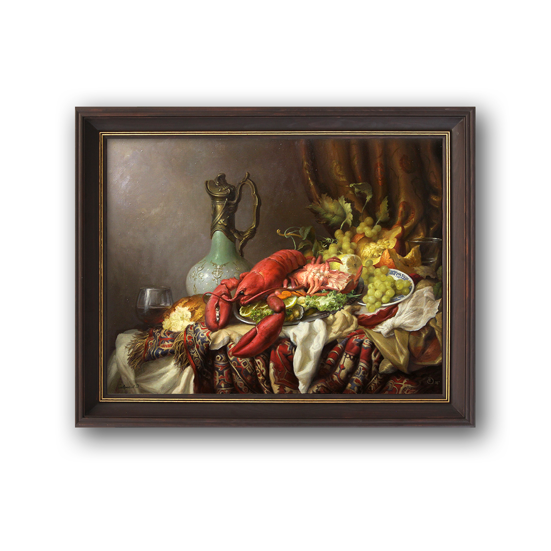 На картине изображён роскошный натюрморт: на богато украшенной скатерти лежат приготовленный лобстер, тарелка с виноградом и другими фруктами, ломтики лимона, зелень. Рядом — изящный кувшин с крышкой и бокал с напитком. Фон выполнен в тёплых, приглушённых тонах, что подчёркивает яркость и сочность продуктов. Композиция обрамлена тёмной рамой с золотой окантовкой.