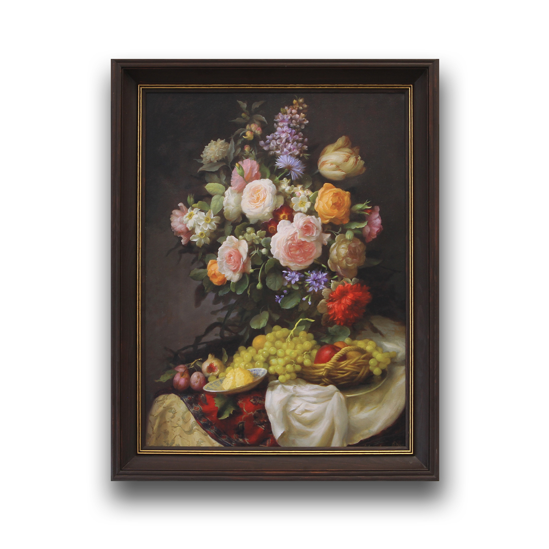 В центре натюрморта пышный букет садовых цветов — розы, пионы, тюльпаны и полевые цветы, собраны в живописную композицию. Их лепестки, написанные с трепетной детализацией, переливаются нежными оттенками — от белоснежного и персикового до глубокого бордового и лавандового.