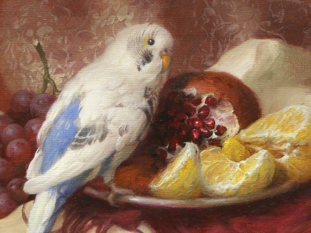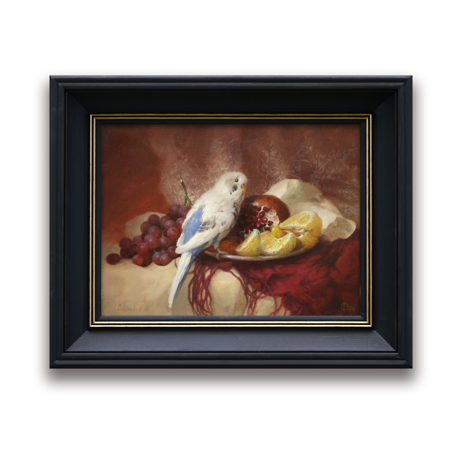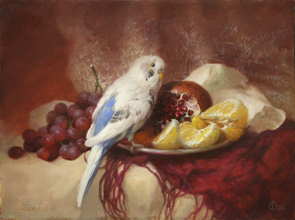 Бело-голубой попугай, сидящий на тарелке, на которой лежат дольки апельсина, гранат и другие фрукты. Слева от попугая — гроздь винограда. Фон выполнен в тёплых коричнево-красных тонах, а композиция дополнена драпировкой из ткани. Картина оформлена в тёмную раму с золотой окантовкой.