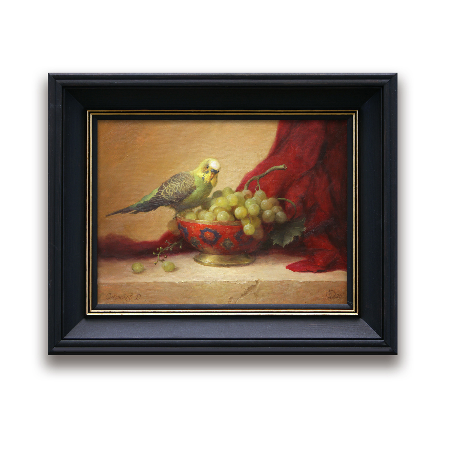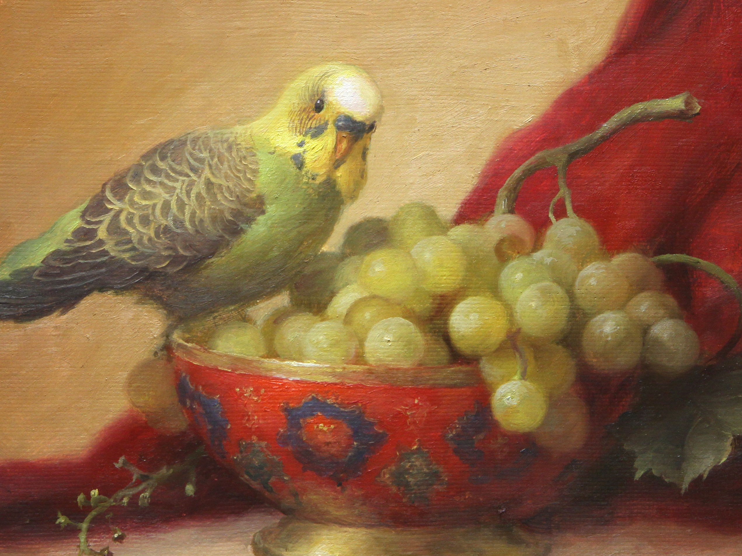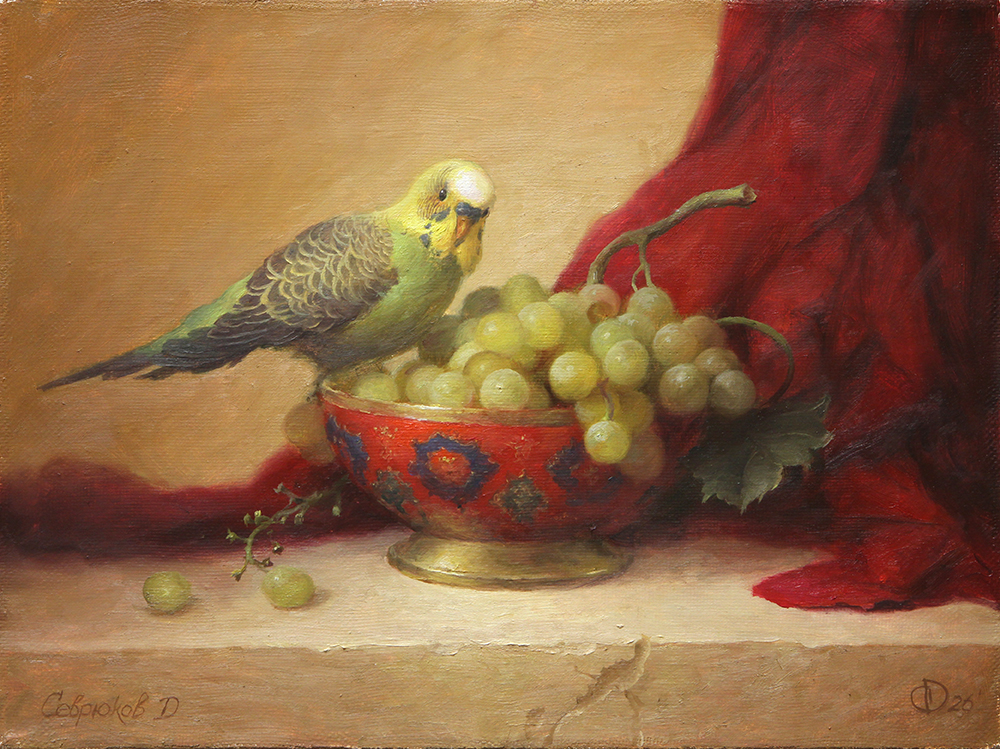 На картине Дмитрия Севрюкова изображён натюрморт: в центре — яркая чаша с орнаментом, наполненная гроздью зелёного винограда. На краю чаши сидит попугай с жёлто-зелёным оперением, будто заинтересованный ягодами. Несколько виноградин рассыпаны на переднем плане. Справа эффектно драпируется насыщенная красная ткань, создающая контраст с тёплым бежевым фоном. Композиция отличается вниманием к деталям и гармоничным сочетанием цветов.